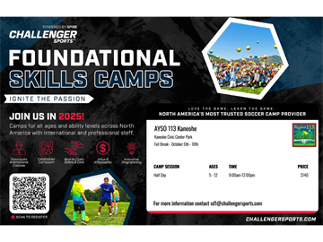 Fall Break Challenger Soccer Camp in Kaneohe! From ages 5 years to 12 years. Sign up today! Details at sd1challengersports.com